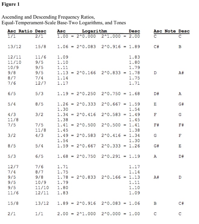 Pianos have musical tones separated by equal ratios. Octave has twelve equal-temperament halftones, with ratios from 2^(0/12) to 2^(12/12) of fundamental frequency. Frequency ratio of halftone to next-lower halftone, such as C# to C, is 2^(1/12) = 2^.08 = 1.06. Starting at middle-C, ratios of tones to middle-C are 2^0 = 1 for middle-C, 2^.08 = 1.06 for C#, 2^.17 = 1.13 for D, 2^.25 = 1.19 for D#, 2^.33 = 1.26 for E, 2^.42 = 1.34 for F, 2^.50 = 1.41 for F#, 2^.58 = 1.49 for G, 2^.67 = 1.59 for G#, 2^.75 = 1.68 for A, 2^.83 = 1.78 for A#, 2^.92 = 1.89 for B, and 2^1 = 2 for high-C. See Figure 1. F# is middle tone.