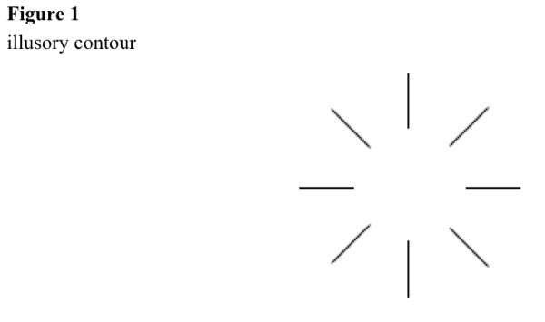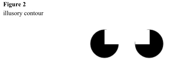 Imagined lines can cause illusions. Illusory circle has a small space between horizontal and vertical lines that do not meet, making a small circle. Illusory triangle has solid figures with cutouts that make angles in needed directions, which appear as corners of triangles with complete sides. Illusory square has solid figures with cutouts that make angles in needed directions, which appear as corners of squares with complete sides.