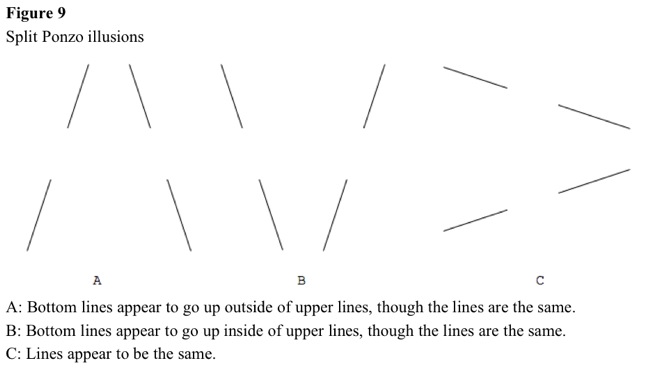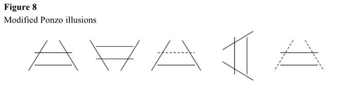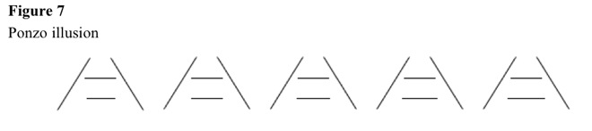 If railroad tracks and ties lead into distance, and two horizontal bars, even with different colors, are at different distances, farther bar appears longer (Mario Ponzo) [1913]. See Figure 7. See Figure 8 for modified Ponzo illusions. See Figure 9 for split Ponzo illusions. Perhaps, line tilt, rather than depth perception, causes Ponzo illusion.