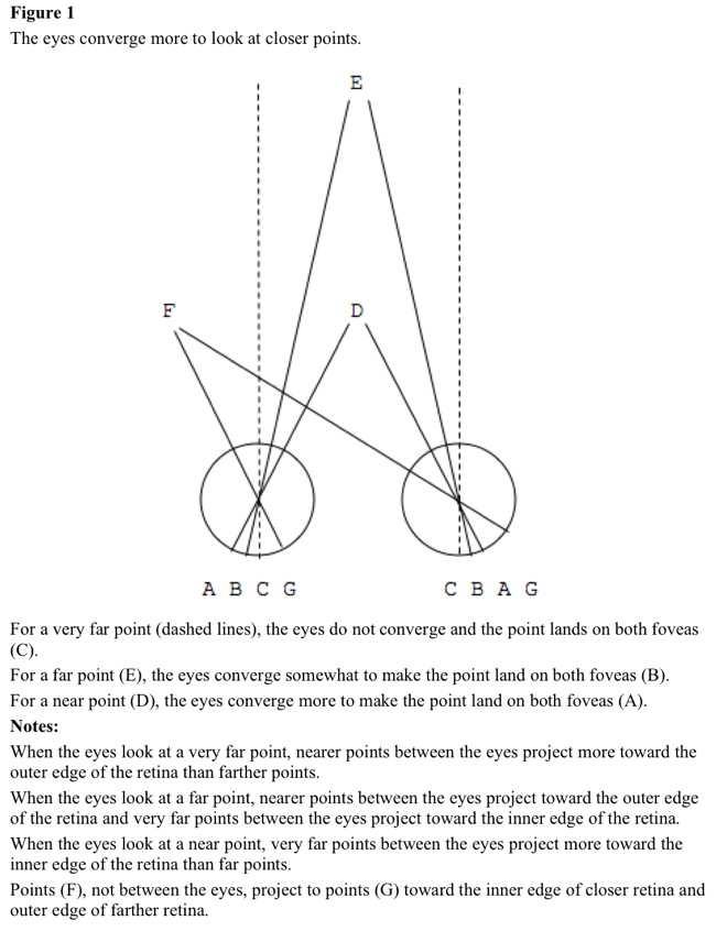 For fixation, both eyes turn toward each other {convergence, eye} {eye convergence} when objects are nearer than 10 meters. If convergence is successful, there is no retinal disparity. Greater eye convergence means object is closer, and lesser eye convergence means object is farther. See Figure 1.