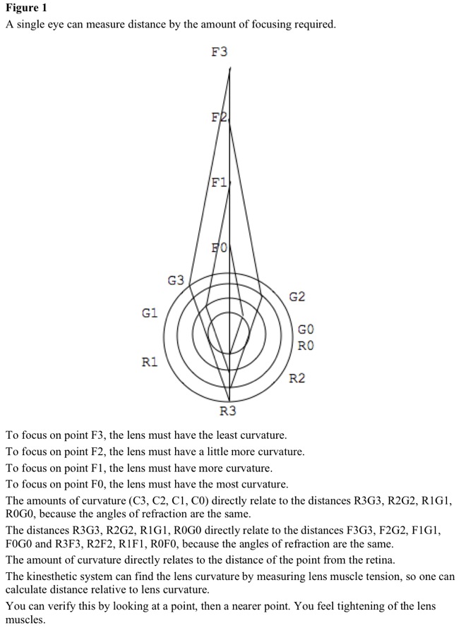 Far objects require no eye focusing. Objects within four feet require eye focusing to reduce blur. Brain can judge distance by muscle tension, so one eye can measure distance. See Figure 1.