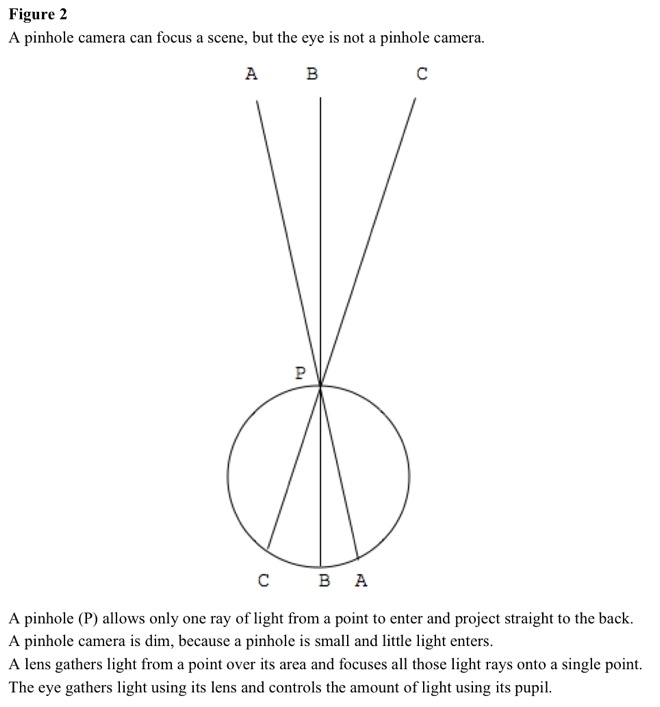 Pinhole camera can focus scene, but eye is not pinhole camera. See Figure 2.