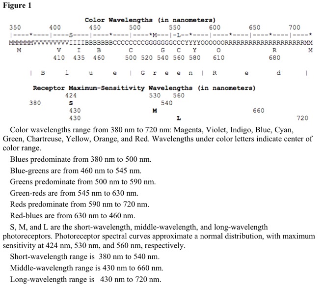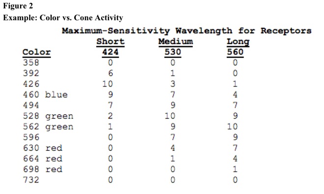 Primates have cones with photopigments with maximum sensitivity at indigo 437 nm (short-wavelength receptor), green 534 nm (middle-wavelength receptor), and yellow-green 564 nm (long-wavelength receptor). Because they have two color dimensions, they may see subjective colors.