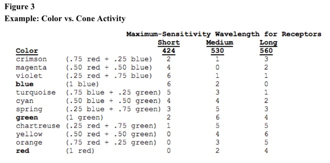 Retina unit areas have one Long-wavelength, one Middle-wavelength, and one Short-wavelength cone. See Figure 1. Any-wavelength light excites all cones. Retina opponent processes calculate L - M and L + M - S. See Figure 2. Comparing opponent processes, using thresholds to separate continuous frequency-intensity spectra into discrete categories, selects three color-categories. If both opponent-process ranges can be from -1 to +1, blue is (-1,-1), green is (0,0), and red is (+1,+1), where the first value is the L - M range, and the second value is the L + M - S range.