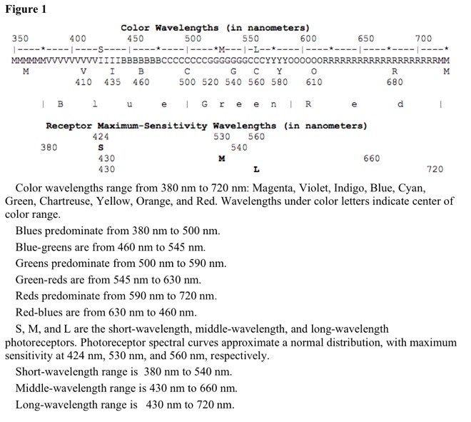 Physically, light waves have frequencies with intensities. Physiologically, colors are dependent and mixed (synthetic) and have brightness, hue, and saturation. Brightness depends on intensity and ranges from dim to bright. People can distinguish 100 intensity levels. Hue depends on average light frequency and ranges across the color spectrum, from red to violet. People can distinguish 100 hues. Saturation depends on light-frequency distribution and ranges from unsaturated to saturated. People can distinguish 100 saturation levels. Brightness, hue, and saturation define colors. People can distinguish one million colors. Vision perceptual processes also find color temperature and color lightness. Relative light intensities determine brightness. People can distinguish 100 brightness levels. Relative salience and activity determine color temperature, which ranges from cool to warm. People can distinguish 100 color temperatures. Relative transparency determines color lightness, which ranges from dark to light. People can distinguish 100 color lightnesses. Color brightness, temperature, and lightness define colors.