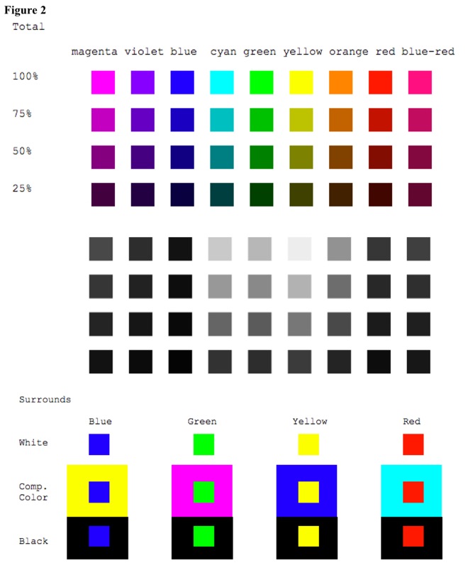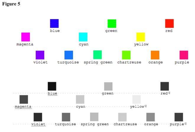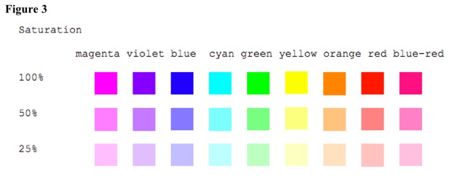 Color saturation depends on electromagnetic-wave frequency distribution [Krauskopf et al., 1982]. Colors can add white, and black can add white. White adds to colors linearly and equally. Complete saturation means no added white. Lower saturation means more white. No saturation means all white. Less saturation makes colors look lighter. See Figure 3. Black looks most saturated. At all saturation levels, blue looks next most saturated, red looks somewhat saturated, and green looks less saturated. White looks least saturated.
