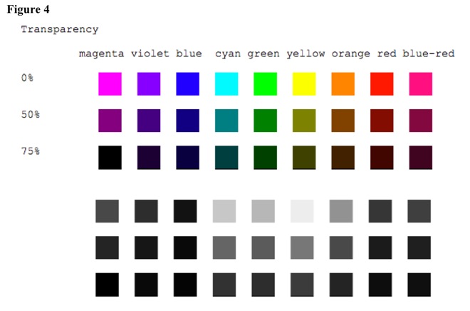 Color transparency depends on source or reflector electromagnetic-wave density. Opaqueness means maximum color density, with no background coming through. Transparency means zero color density, with all background coming through. See Figure 4. With a white background, opacity is the same as saturation, and transparency is the same as no saturation, so colors are the same as in Figure 3. With a black background, opacity is the same as lightness, and transparency is the same as darkness, so colors are the same in Figures 2 and 4. Blue looks most opaque, and green looks least opaque.
