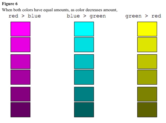 For all color brightnesses, when both colors have equal brightness, black suppresses one color more {color strength}. Red is stronger than blue, because frequency is lower and wavelength is higher. Blue is stronger than green, because frequency is lower and wavelength is higher. Green is stronger than red, because frequency is lower and wavelength is higher. See Figure 6. Less blue needs to balance green and red, so blue is darker than red and green. Less red needs to balance green, so red is darker than green.