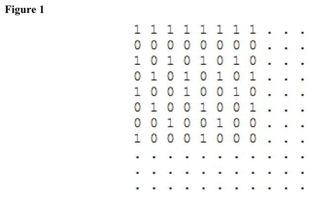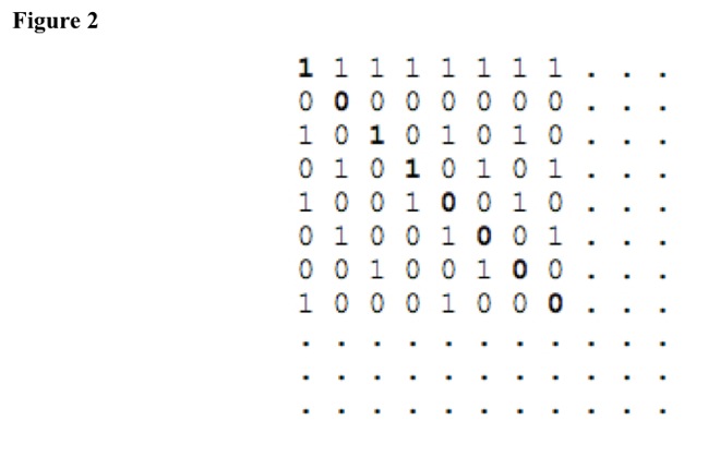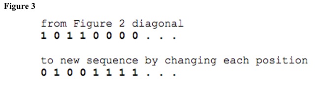 Change marks at intersections of first row and column, second row and column, and so on. See Figure 3. New digit sequence has same length as the others and is unique natural number. It is not the same as any row or column sequence. It differs from first row and column at first number, differs from second row and column at second number, and so on.
