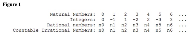 Numbers of natural numbers, integers, rational numbers, and countable irrational numbers are equal, because they can be put in one-to-one correspondence with counting numbers. See Figure 1.
