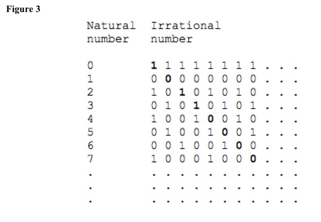 Try to align natural numbers with non-countable irrational numbers in one-to-one correspondence by making an array, with natural numbers on one axis and non-countable irrational numbers on other axis. See Figure 2.