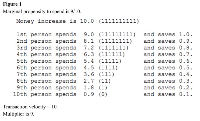 Assume average marginal propensity to spend is 90% = 9/10. For every 10 extra dollars, average person spends 9 dollars and saves 1 dollar. See Figure 1. After 10 people receive remaining money, changes are insignificant, so transaction velocity is 10. Multiplier is approximately 9.