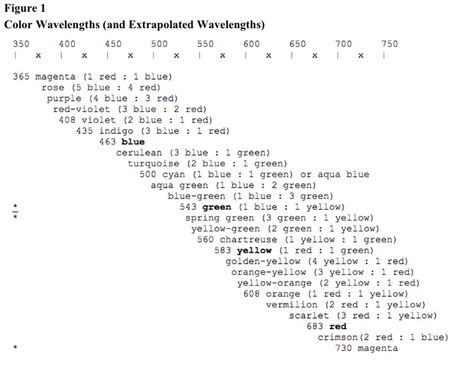 Spectral colors have maximum purity at specific wavelengths: red = 683 nm, orange = 608 nm, yellow = 583 nm, chartreuse = 560 nm, green = 543 nm, cyan = 500 nm, blue = 463 nm, indigo or ultramarine = 435 nm, and violet = 408 nm. See Figure 1. Magenta is not spectral color but is red-violet, so assume wavelength is 730 nm or 375 nm.