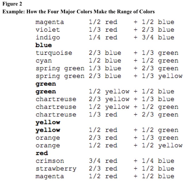 Spectral colors have maximum purity at specific frequencies: red = 436 THz, orange = 497 THz, yellow = 518 THz, chartreuse = 539 THz, green = 556 THz, cyan = 604 THz, blue = 652 THz, indigo or ultramarine = 694 THz, and violet = 740 THz.