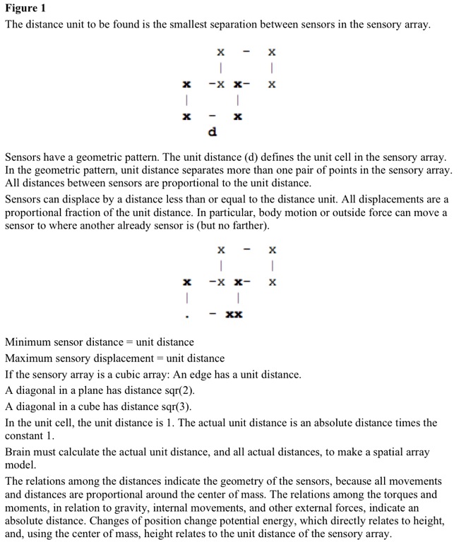 Body movements cause correlated sensations. As babies move body and limbs, they encounter air, fluid, and solid surfaces, including own body. For example, walking and running establish airflow gradient from front to back. Correlating sensations and movements, brain builds position and relation memories and places surfaces in body-centered space. From surfaces, brain builds horizontal ground, front and back, up and down, right and left, vertical, straight-ahead, and across. From directions and coordinates, brain learns what happens when body moves from place to place and so locates body parts and surfaces in space.