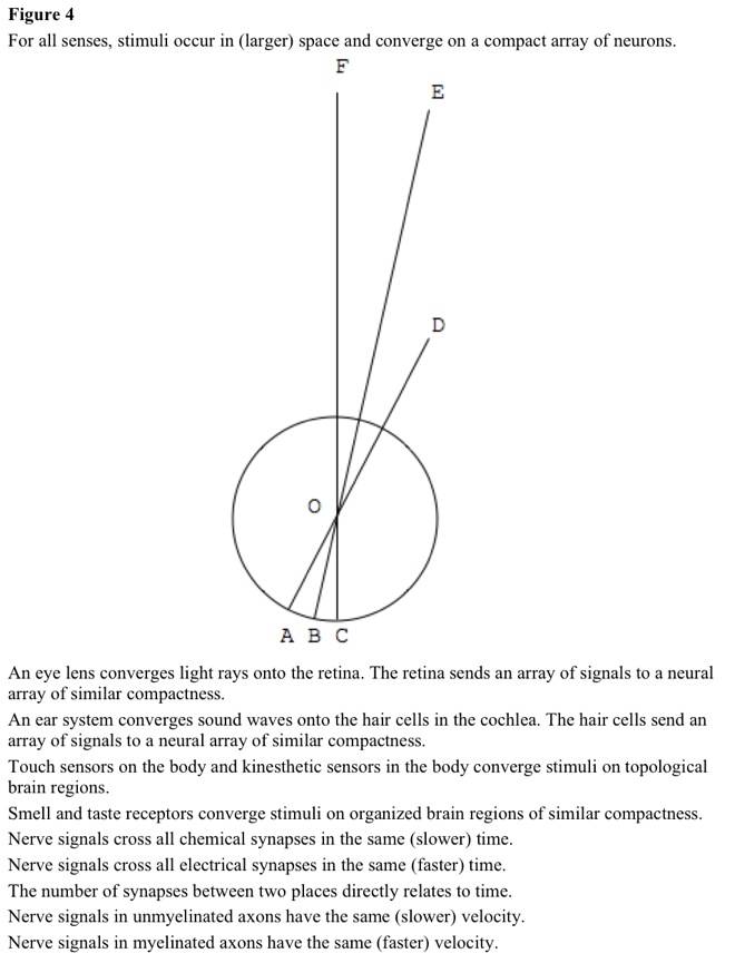 For all senses, stimuli are in larger space, and signals converge on smaller neuron arrays. See Figure 4.