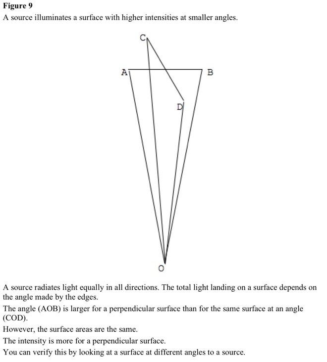 Surfaces perpendicular to light-source direction have highest intensity. Surfaces at smaller angles have lower intensities. See Figure 9.
