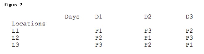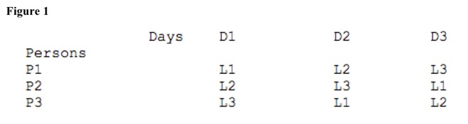 Table has Days columns D1, D2, ... and Persons rows P1, P2, ... Table cells have Locations L1, L2, ..., with L1 in D1-P1 cell, and so on. See Figure 1. You can pivot table to make table with Days columns, Locations rows, and Persons in cells. See Figure 2. Cells fill by rule: Days and Locations have Persons. You can always pivot new table back to old table.
