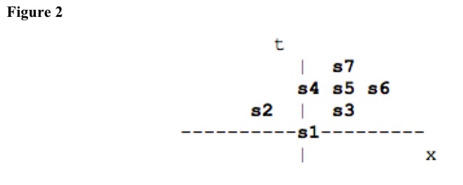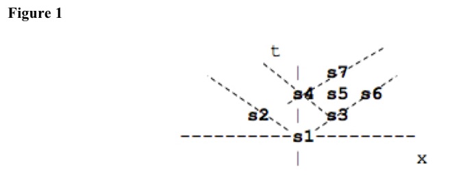 At s1, observer has time 0 and position 0. s2 and s3 happen at same time on time axis, and information about them reaches s4 at same time.
