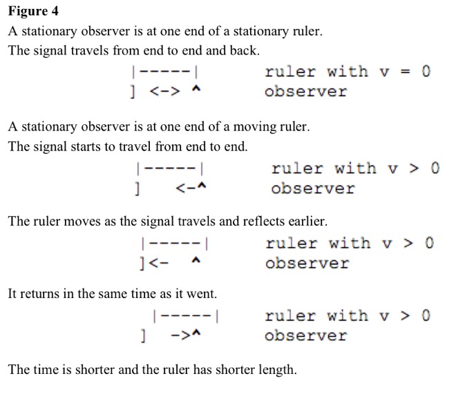 To measure stationary rulers, stationary observers at one ruler end can send signals to a reflector at other end. See Figure 4. Signal travels from end to end and back. Time to go is same as time to return. Travel time is directly proportional to length.