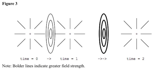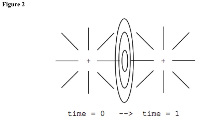 See Figure 5. Collision, gravity, or electric force can accelerate charge. Acceleration makes force, so fields change. Acceleration is transverse to radial electric-field line, so test charge has transverse motion. See Figure 6.