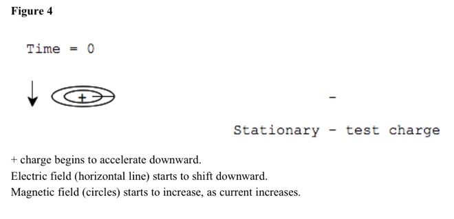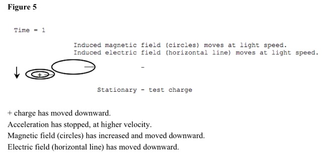 When induced electric field and magnetic field reach far-away test charge, electric-field vertical component accelerates test charge. See Figure 6.