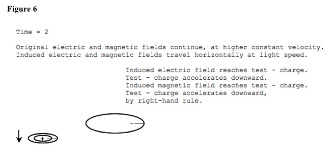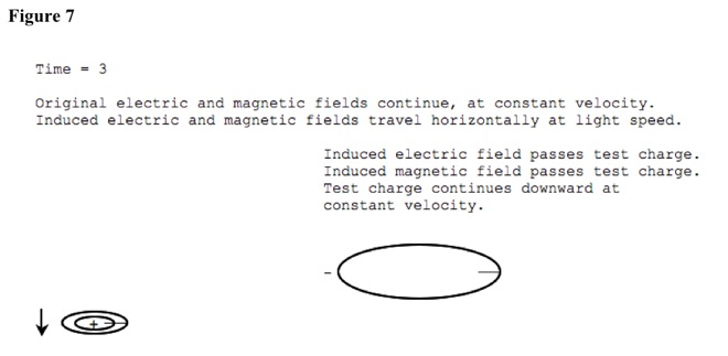 When induced electric field and magnetic field pass far-away test charge, test charge continues at constant velocity. See Figure 7.